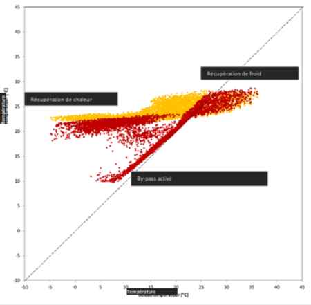Lorsque le by-pass était activé, la température de l’air pulsé était proche de la température extérieure. Lorsque la récupération de chaleur ou de froid était utilisée, la température de l’air pulsé était proche de la température intérieure.