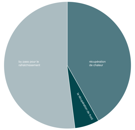 « Selon les saisons, la ventilation est équilibrée de manière différente. Le système de ventilation commute automatiquement entre la récupération de chaleur, la récupération de froid et le rafraîchissement passif. Cette commutation se fait en fonction de la température ambiante souhaitée et de la température extérieure. »